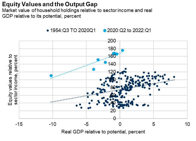 Source: Household holdings of corporate equites relative to sector income, Financial Accounts of the US (Federal Reserve) and real GDP (Bureau of Economic Analysis) relative to its potential (Congressional Budget Office), all accessed via FRED, 8/13/22.